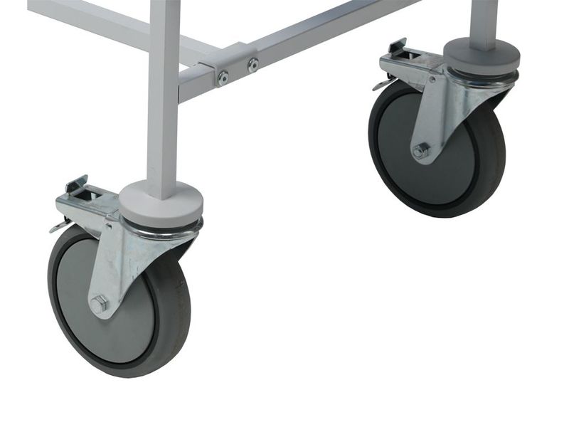 - Колеса поворотные, самоориентирующиеся, ∅ 200 мм, из немаркой серой резины, не оставляющего следов на полу, два колеса — с индивидуальным тормозным устройством